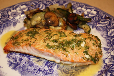 The salmon cooked well and I paired it with a side of roasted mushrooms, zucchini, and onions. I first tried the salmon without the sauce and I thought it had a really unique flavoring. I could have eaten it without the sauce but I wanted to try it and thought it complimented the salmon very nicely. We both agreed that this meal has a much stronger fish taste than other salmon recipes we’ve tried. Ryan liked this dish but he still has his all-time favorite salmon recipe (Dry-Rubbed Salmon with Cucumber Relish). Overall I feel the ingredients make this a wonderful dish to serve in the summer.